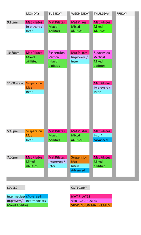 I advise everyone new to Pilates to start with a Mat Based Class for Beginners. If this is not possible a Mixed Abilities class, where exercises are layered to meet the individuals strengths and abilities.